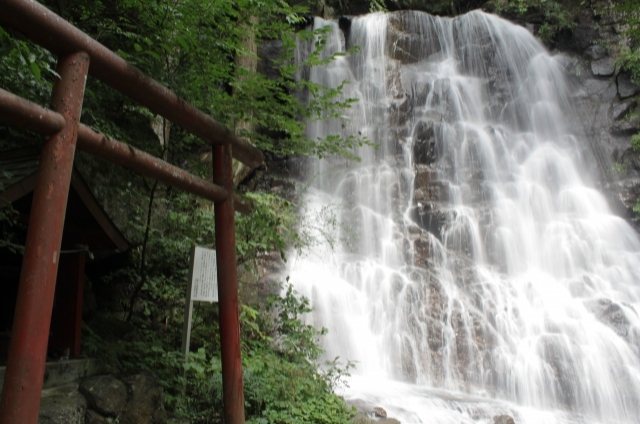 精進ヶ滝は、石空川渓谷(いしうとろがわけいこく)にある、日本の滝百選に選ばれた名瀑です。落差121mのまっすぐに流れ落ちる滝の流れは、少し離れた滝見台から見ても圧巻です。